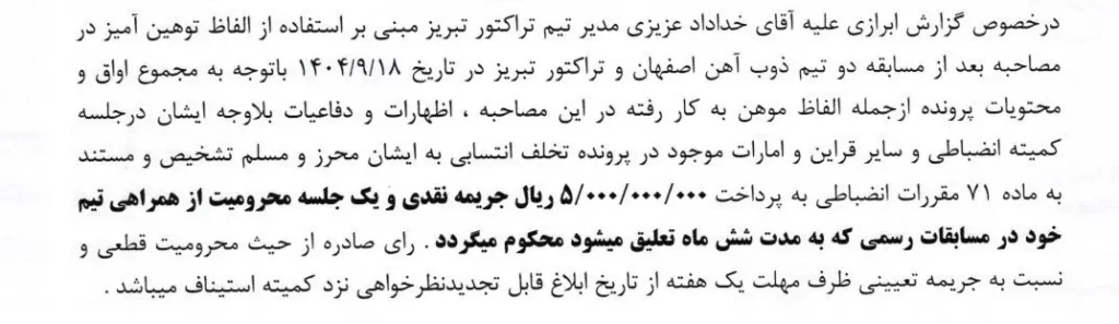 رأی کمیته انضباطی در خصوص تخلف خداداد عزیزی، مدیر تیم تراکتور، به شرح زیر صادر شد: